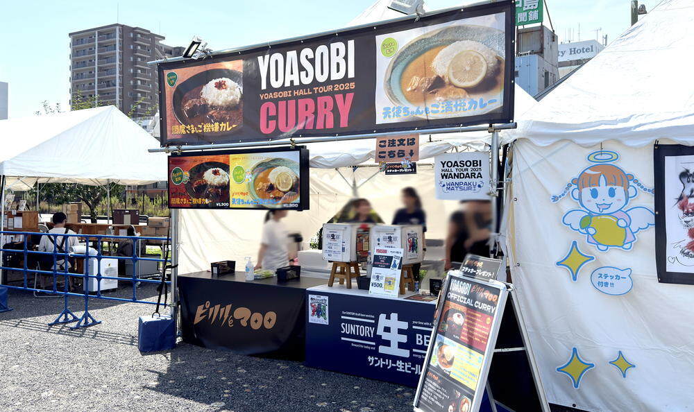 YOASOBI監修カレー【ピリリとマロロ】通販もされているAyaseさん・ikuraさんそれぞれ監修の2種のカレーと、ライブ特別協賛のサントリー生ビールを販売。
