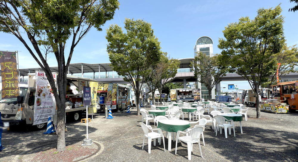 静岡市内のグルメ店舗やキッチンカー合計14店舗が飲食販売で出店!広場の中心にはイートイン可能なテーブルスペースも席数多めに用意されていました。