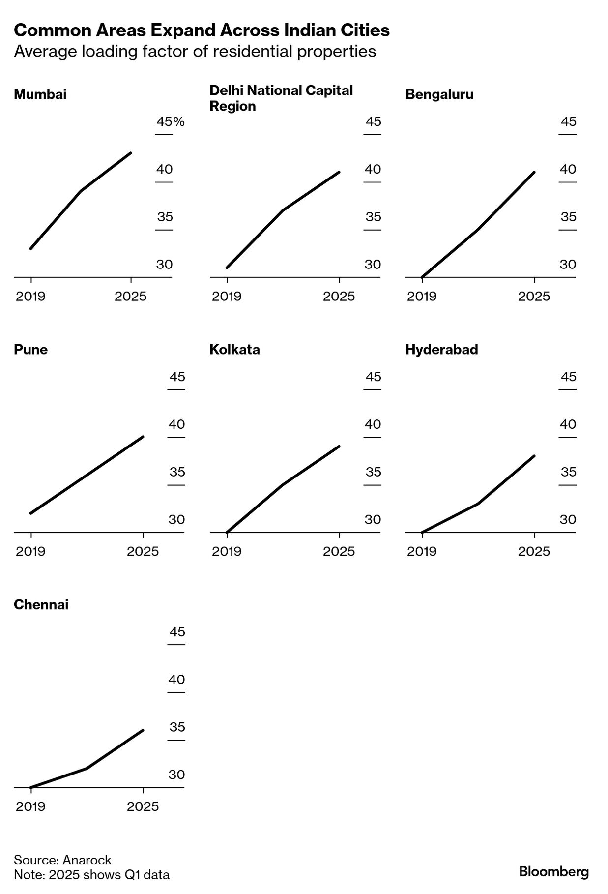 他のインドの都市と比べ、ムンバイの高層住宅では、建物全体で共用部分の面積が占める比率が最も高い。同国の不動産業界ではこれを「ローディングファクター」と呼び、ムンバイで今年建設された住居用ビルでは平均43%となっている。これは1000平方フィート(約93平方メートル)と銘打たれた物件の場合、430平方フィートが共用部分に充てられ、残り570平方フィートが居住者の専有部分となる。