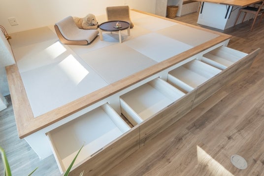 段差のないバリアフリーな設計は、お掃除ロボットの活用も想定したもの。小上がりの中にはロボット掃除機の“発着基地”を設け、見た目にもすっきりと収納しています。