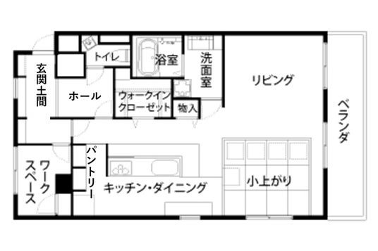 玄関土間を抜けてリビングに向かうと右手に現れるのは、大容量のパントリー。玄関からパントリーを通ることで、買い物帰りでもすぐに収納ができます。収納力を十分に確保しつつ、パントリー→キッチン→リビングへの回遊性も高く、家事の動線を効率化します。キッチン前にはL字型のカウンターを設置し、食後の片付けがぐっと楽になりました。ダイニングテーブルを置かずに済む分、リビングにはゆとりが生まれ、お子様の勉強スペースとしても活用できます。また、住まいの中央にはウォークインクローゼットを配置し、洗濯後の片付けがしやすくなるよう配慮しました。
