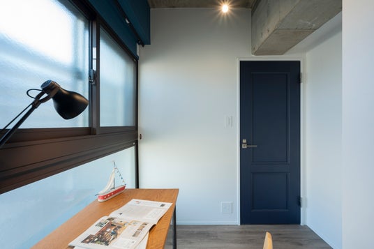 玄関奥には、リビングと離れた位置にワークスペースを設置。音を気にせず作業に没頭できる、プライベートな空間です。天井は躯体現しに仕上げ、ネイビーの扉や塗装を施さない鉄管など、無骨さを残したデザインが空間に個性を添えています。