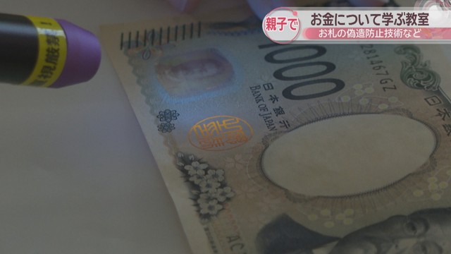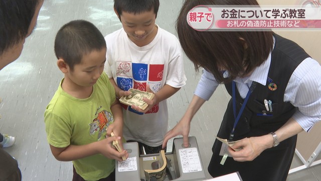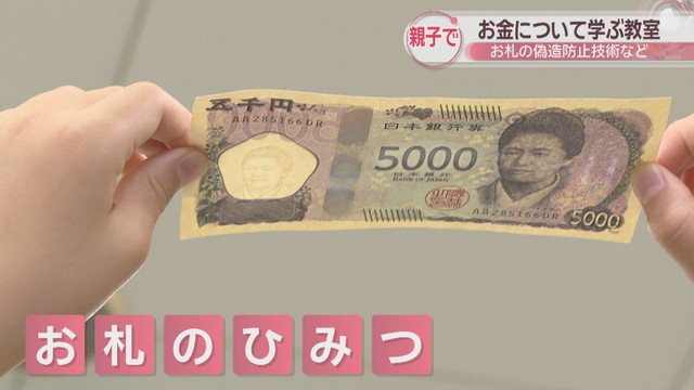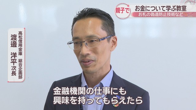 お札の偽造防止技術など親子でお金について学ぶ教室が高松市で開かれました。