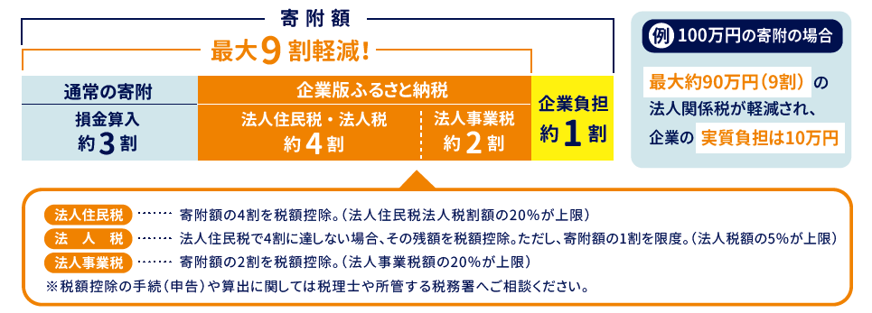 損金算入による軽減効果(寄附額の約3割)とあわせて、税額控除(寄附額の約6割)により、最大で約9割が軽減され、実質的な負担が約1割まで軽減されます。