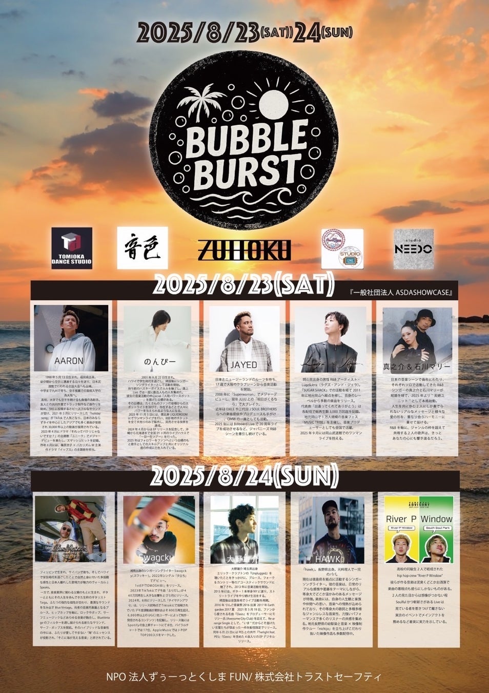 「BUBBLEBURST 2025」は、徳島県徳島市・小松海岸を舞台に開催される、音楽とストリートダンスが融合した無料の野外フェスティバルです。主催は、地域共創型イベントを手がけるNPO法人ずぅ~っとくしまFUN(徳島県徳島市)。若者からご家族まで、多世代が一緒に楽しめることをテーマに、多彩なプログラムが企画されています。