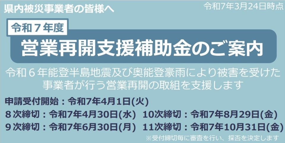 石川県は、能登半島地震や奥能登豪雨で被害を受けた事業者(半壊以上)に対して営業再開に必要な仮施設などの整備費を支援する営業再開支援補助金について、新年度も公募を継続する。申請の受け付け開始は4月1日で、締め切りは8次=4月30日▽9次=6月30日▽10次=8月29日▽11次=10月31日-となっている。