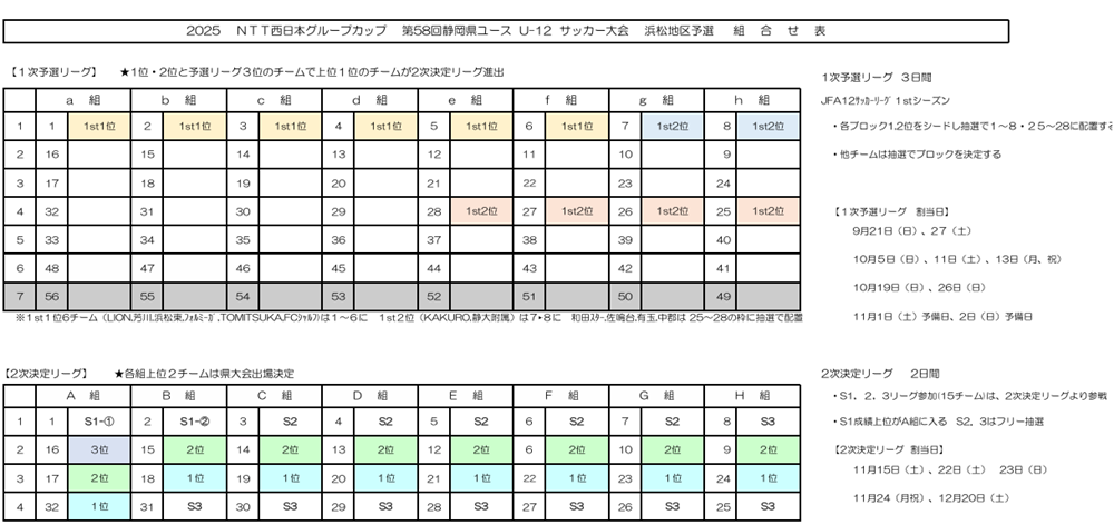 ①シード制について。1次予選リーグは2025JFA U12サッカーリーグ1stシーズンの各組1,2位を組合表のとおり配置する。2次決定リーグは1次の結果に基づき、抽選により決定する。なお、S1,2,3リーグ参加チームは2次から参加する。