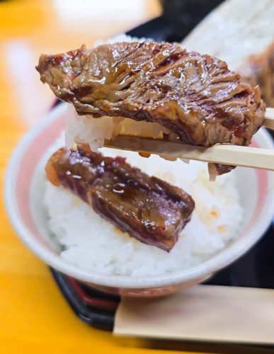 ご飯に乗せて食べると、東伯牛の旨みとステーキソースの味が滲みわたり、おかわりしたくなるほど。