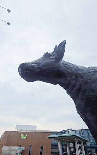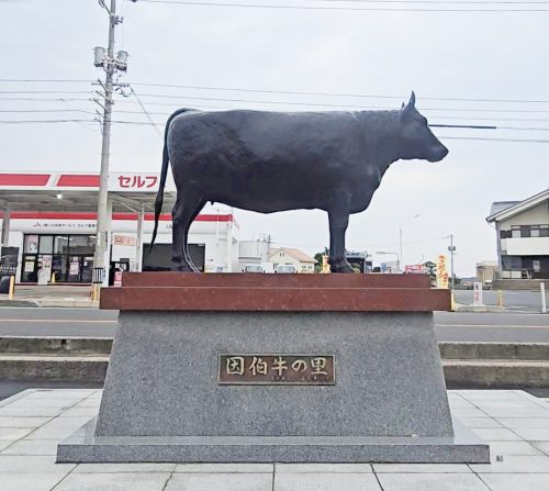 道路沿いには、石碑に「因伯牛の里」と書かれた牛の銅像があります。