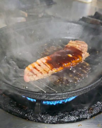 十分に熱したフライパンに入れ、強火で一気に焼き上げます。最後に自家製のステーキソースをかけて完成です。