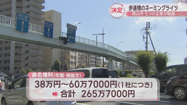 年間の命名権料は税抜きで1社あたり38万円から60万7000円で、5社合わせると年間265万7000円になります。岡山市は歩道橋の維持管理などに充てるとしています。