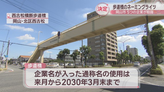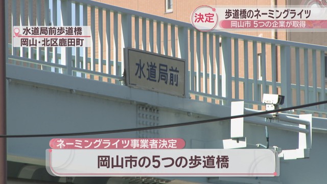 ネーミングライツの取得事業者が決まったのは、岡山市北区鹿田町の水道局前歩道橋など5つの歩道橋です。