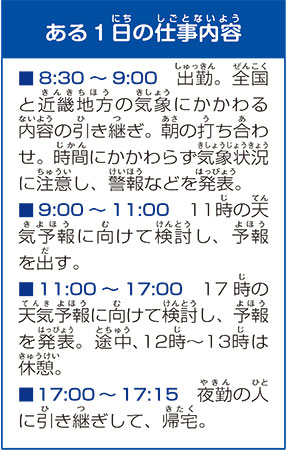 天気の変化を予測し、時には警報や注意報を出す予報官。台風や暴風など生活にかかわる情報を教えてくれる大切なお仕事です。