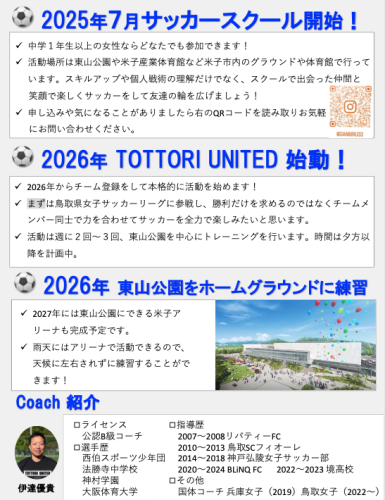 2026年、本格的に活動を始める予定の「TOTTORI UNITED」。ホームグラウンドは米子市の東山公園、未来の女子サッカーを担う新チームです。
