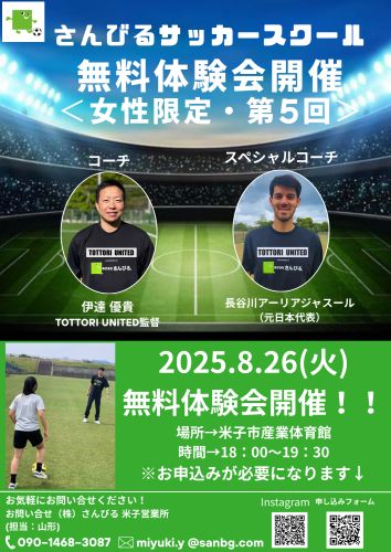 鳥取県米子市で、女性のための「さんびるサッカースクール無料体験会」が開催されます。会場は米子市産業体育館。日時は2025年8月26日(火)18:00~19:30となっています。