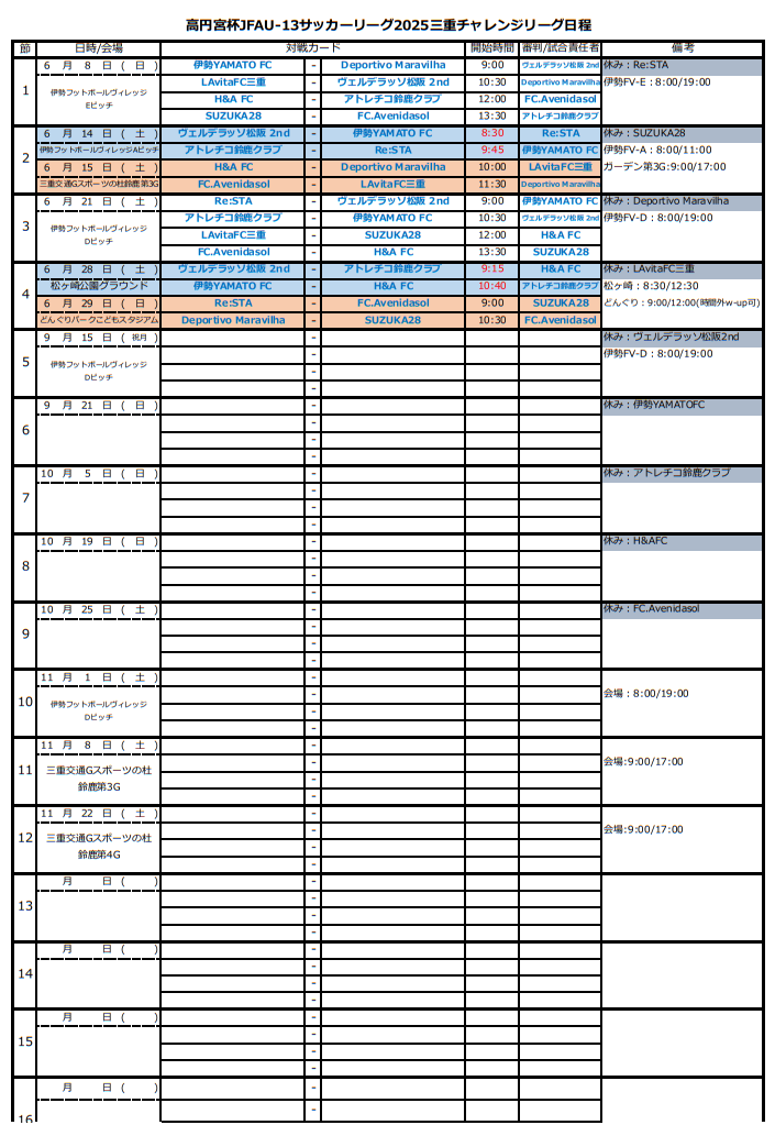 FC.Avenidasol、H&AFC、アトレチコ鈴鹿クラブ、伊勢YAMATO FC、ヴェルデラッソ松阪2nd、LAvitaFC三重、Deportivo Maravilha、Re:STA、SUZUKA28FC