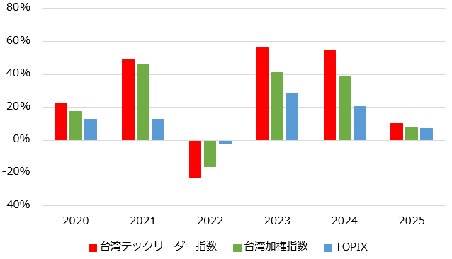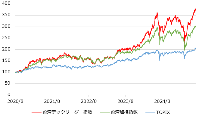 ※台湾テックリーダー指数、台湾加権指数、TOPIXいずれも配当込み、円ベース