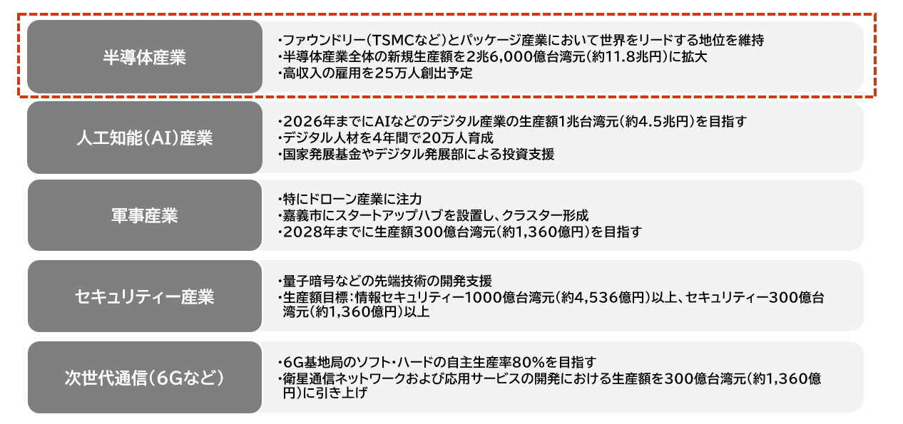 台湾政府は、2024年9月に半導体、AI、軍事、セキュリティ、次世代通信の5分野を重点的に育成する国家戦略「5大信頼産業推進政策」を掲げました。中でも半導体産業については、同国が現在有する国際的な競争優位性を維持・強化するとともに、さらなる投資の促進や雇用の創出を重要な目標として掲げています。