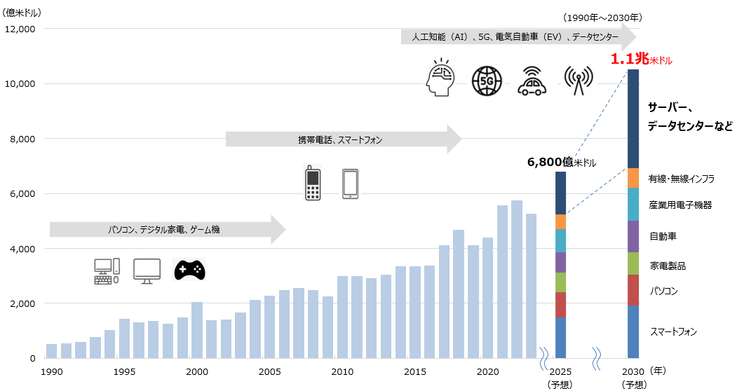 スマートフォンやパソコンなど私たちの生活に関わる身近なものから、5Gやデータセンターなど社会全体を動かすインフラまで、あらゆるものに使われている半導体。近年のデジタル化の加速や生成AIの普及を背景に、半導体市場は拡大を続けています。