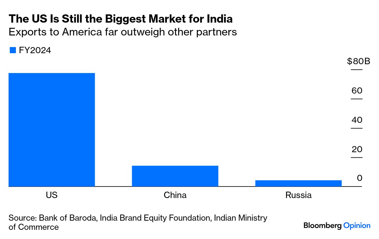 米国はインド製品の最大の輸出先で、米市場の大きさは圧倒的だ。24年度に米国の消費者がインド産品775億ドル(約11兆4600億円)相当を購入したのに対し、中国とロシアへの輸出はごくわずかだった。