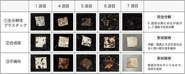また、日本マタイは、生分解性プラスチック、合成紙、不織布の3素材を対象に、約60℃・高湿度の土壌環境下で生分解性試験(※)を実施。週ごとに外観と強度を観察した結果、生分解性プラスチックは自然条件下で分解が進みやすい一方、合成紙や不織布は高い耐久性を示し、用途に応じた適切な使い分けが有効であることが確認された。
