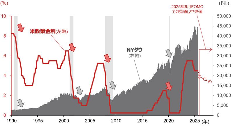(注)データは月次(月初値)で、直近値は2025年8月1日時点。米政策金利はFF(フェデラル・ファンド)金利で、2008年12月以降は誘導目標の上限金利。薄い灰色の網掛けは全米経済研究所の定義による景気後退期。矢印はビハインド・ザ・カーブ(景気後退の後追い的な急な金融緩和)となり、急速な利下げと株価の下落が同時に起こった時期を強調。2025年6月FOMCでの見通しは25年末、26年末、27年末の値。