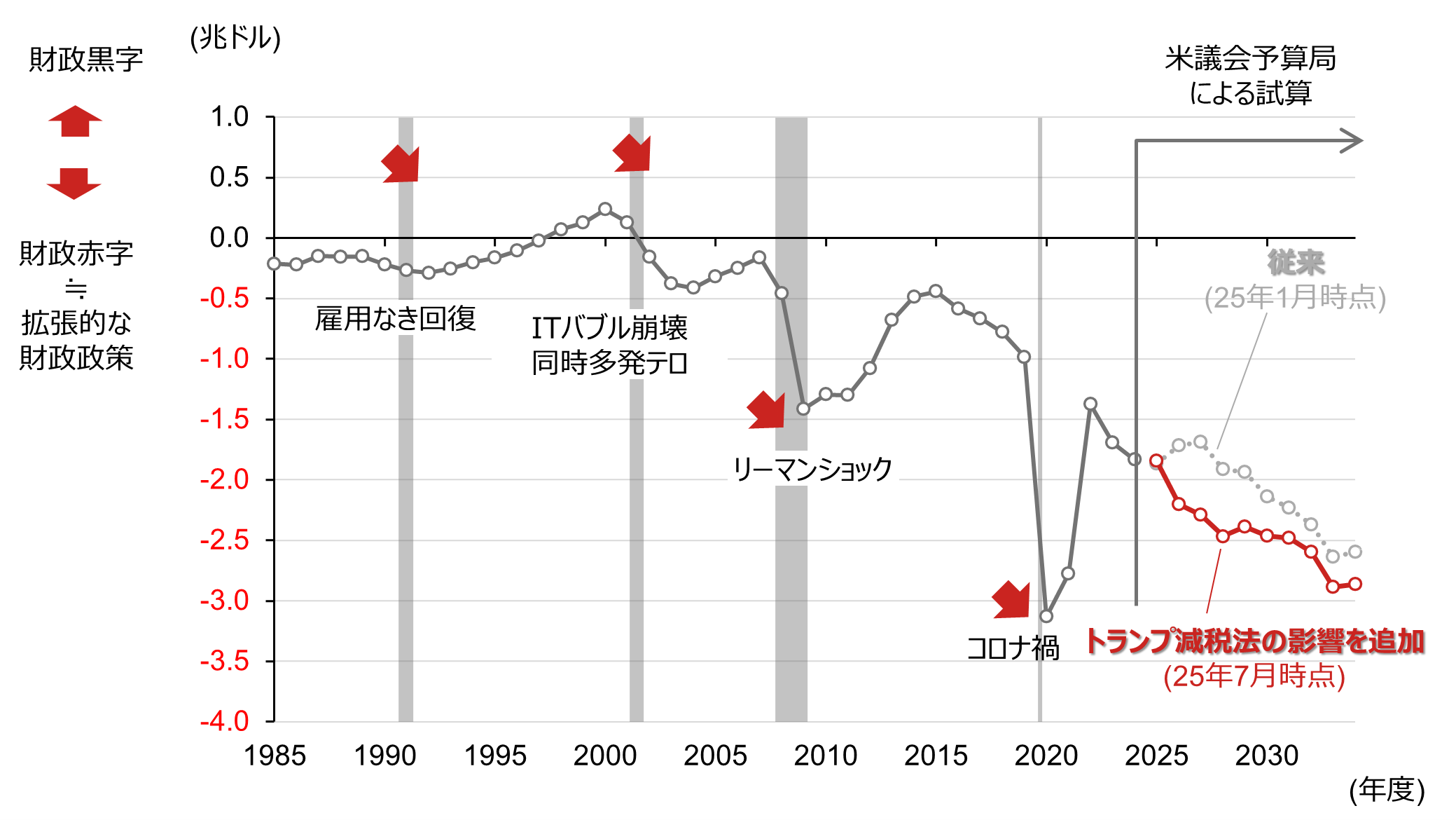 (注)トランプ減税法は、OBBB法(One Big Beautiful Bill Act、1つの大きく美しい法)を指す。イベントは全てを網羅している訳ではない。米議会予算局の試算は2025年7月21日公表値。灰色の網掛けは景気後退期局面。年度は前年10月から当年9月。データは年次で、直近値は2024年度。矢印は灰色の網掛けの景気後退期以降に財政赤字が増加したことを強調。25年7月時点の試算には関税率引き上げ等の影響は含まれない。