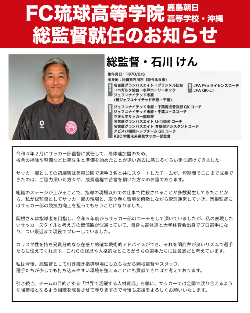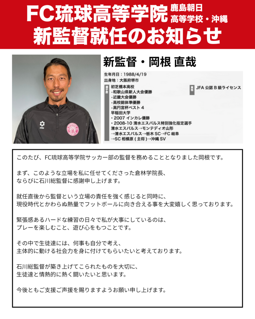 FC琉球高等学院 鹿島朝日高等学校・沖縄サッカー部がこのたび、チームのさらなる発展を目指し、岡根コーチを監督に、監督であった石川を総監督として組織を編成することになりましたので、お知らせいたします。