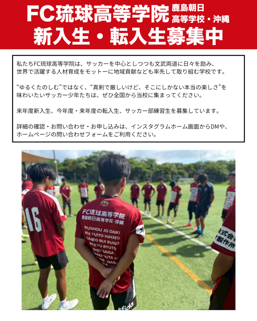 FC琉球高等学院 鹿島朝日高等学校・沖縄サッカー部では、来年度新入生募集中!