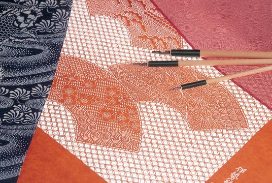 伊勢形紙は、柄や文様を着物の生地に染めるために用いるもので、千年余りの歴史を有します。柿渋を用いて和紙を貼り合わせた紙に、細かい刃先の彫刻刀で着物の文様等を丹念に彫り抜いたもので、形紙を作るには高度な技術と熟練の技が必要です。形紙の彫り方には、錐彫り、突彫り、引彫りなどの技法があり、柄の種類によって使い分けます。近年では、伊勢形紙は染色用具としてだけではなく、美術工 芸品や建具、インテリアとしても用いられています。1983年(昭和58年)4月27日から経済産業大臣指定の伝統的工芸品に指定されています。