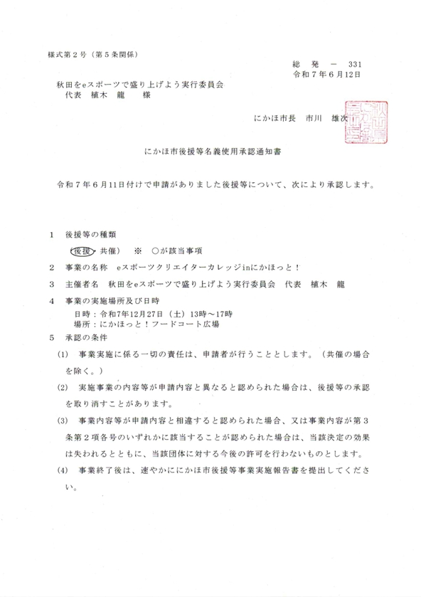 ※プロeスポーツチームVAMOS VAMOS esportを運営する株式会社 GamingV様、秋田県由利地域振興局様、にかほ市長様からプロジェクトを行うこと、名称と画像掲載を行うことの許諾を取得しております。