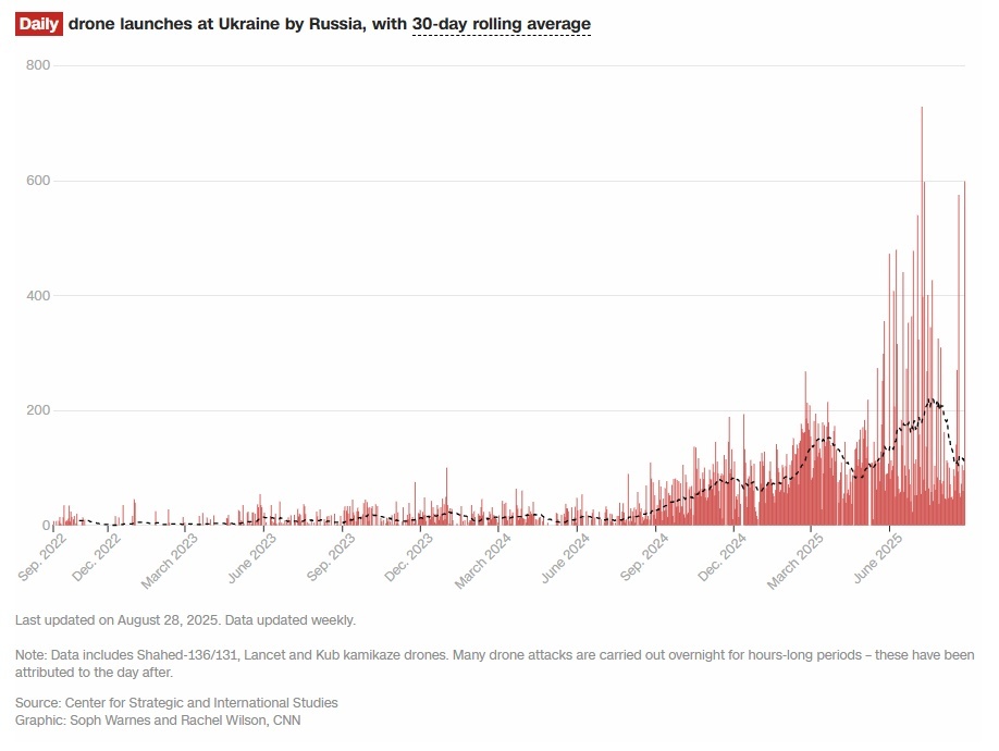 以下の図はロシアによるウクライナに対する1日あたりのドローン発射回数を示したものだ。今年、一晩で記録された最大の攻撃は7月9日の728回で、昨年の193回を上回った。