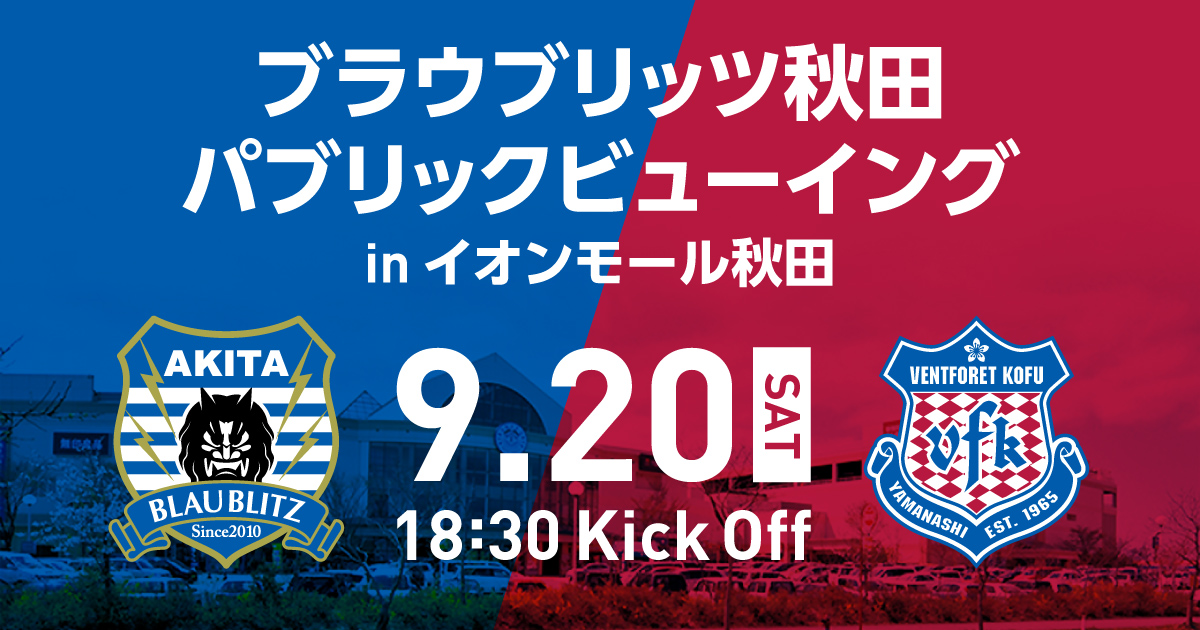 9月20日(土)18時30分キックオフの「2025明治安田J2リーグ 第30節 ヴァンフォーレ甲府 vs ブラウブリッツ秋田」について、イオンモール秋田にてパブリックビューイングを開催することとなりましたので、お知らせいたします。
