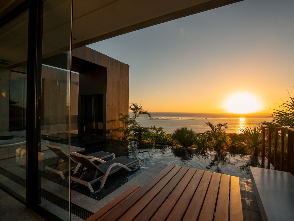 何よりも沖縄の⾼台に位置し、東シナ海や伊江島を望む圧巻のパノラマビュー。温⽔インフィニティプール、屋外ジャグジー、プライベートサウナ(セルフロウリュのフィンランド式サウナHARVIA)を完備しており、季節や天候を問わず⼀年中快適に利⽤できる環境を整えているからこそ、キッチンを活用し、ゲスト⾃⾝で沖縄の旬の⾷材に興じるといった、この地に“暮らすように泊まる” 時間を推奨しているからだ。