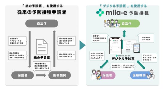 この度、連携協定における取り組みの第一段階として、こどもの定期予防接種(A類疾病)において「mila-e 予防接種」をトライアル導入し、実証事業を行う運びとなりました。2025年9月より、ロタウイルス・B型肝炎・小児用肺炎球菌・五種混合ワクチン接種者を対象に運用を開始します。