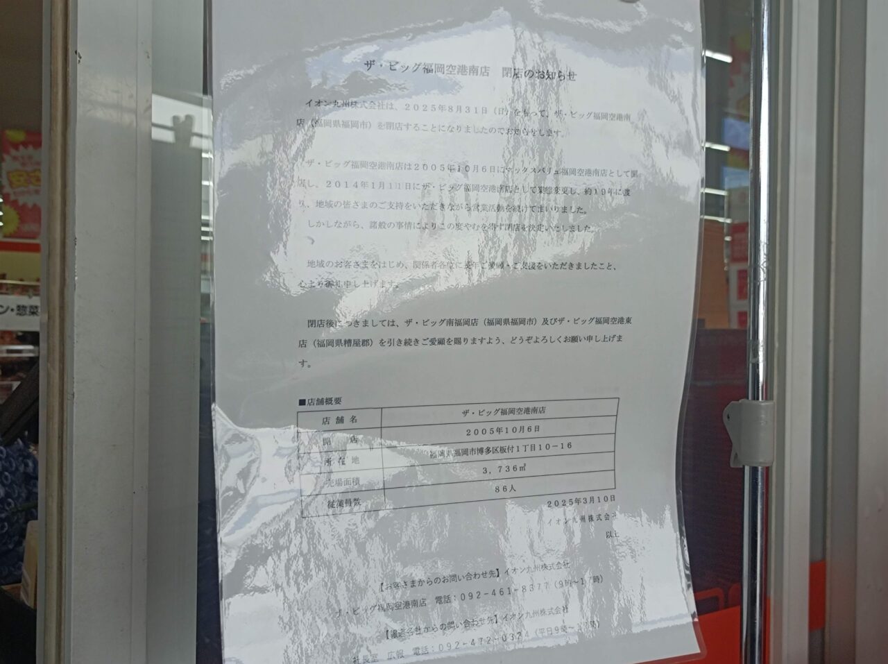 福岡市博多区板付1丁目、福岡県112号沿にある「ザ・ビッグ 福岡空港南店」が、2025年8月31日をもって閉店することが分かりました。