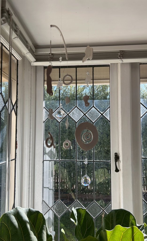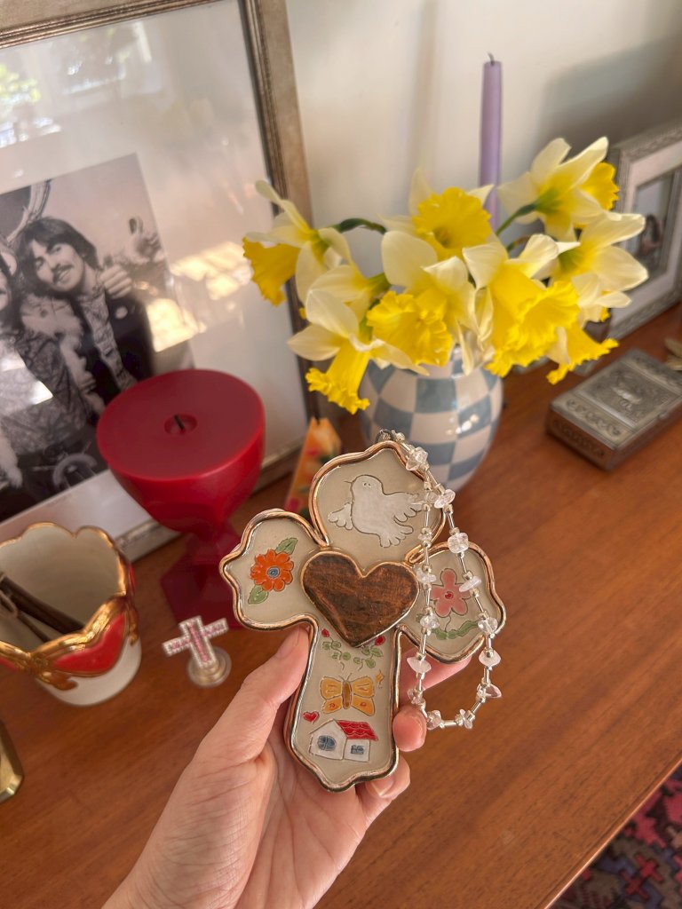 最近のお気に入りは、平和や愛をテーマに作った十字架のシリーズだそう。「自分の部屋にもぴったりと合うんです。メルボルンに来てから太陽や空がより大好きになったので、サンキャッチャーも作り始めました!」