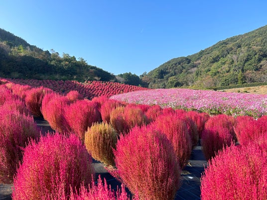 約9,000平方メートル の緩やかな斜面には、春はネモフィラ、夏はヒマワリ、そして秋にはコスモスと鮮やかに色づくコキアの共演が楽しめます。特に秋は、深紅のコキアとコスモスが織りなす美しいコントラストが、訪れる人々を魅了します。