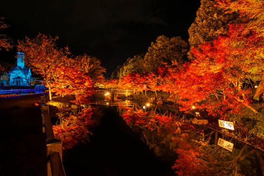 また日没後のライトアップされた紅葉が美しいことでも有名で、特に注目スポットの鏡池は、イロハモミジなど、赤と黄色で鮮やかに彩られた紅葉をお楽しみいただけます。