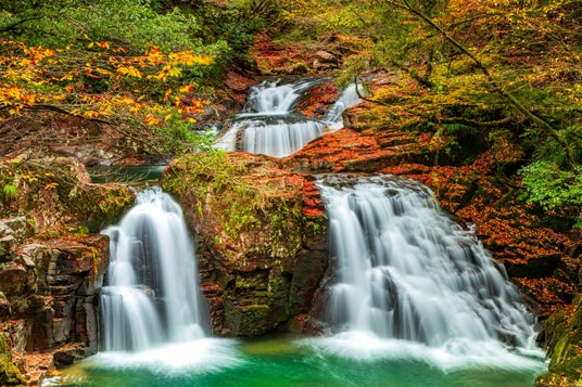 伊賀と大和の国境を流れる滝川の上流に連なる数々の瀑布が美しい大自然のアートを作り出す赤目四十八滝。その長さは約4キロにも及びます。赤目の神秘的な自然は、平成の名水百選、日本の滝百選、森林浴の森百選、そして遊歩百選にも選ばれ、その渓谷に織り成す樹木、渓流、滝などの奏でる優雅な色彩と音のハーモニーが自然をより楽しませてくれます。秋は、イロハモミジ、カエデ、ヤマザクラなどが渓谷を赤く染め、さらに格別です。