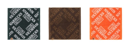 全面に〈STARBUCKS STAND by BEAMS〉のロゴを配した総柄デザインのハンドタオル。