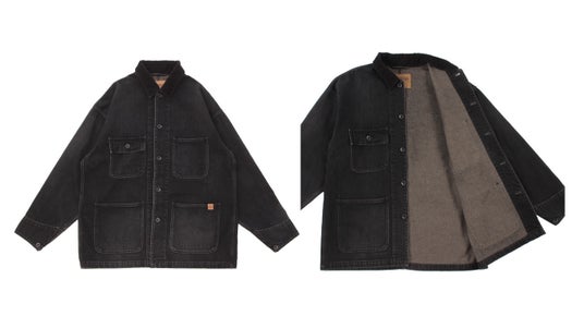 日本製の12.5オンスブラックデニムを採用したカバーオール。ブラックデニムの色目を落とした後、色の抜けた部分にコーヒー豆の捨て殻を利用した染色剤で特殊な後染め加工(製品洗い)を施し、上品で深みのある表情に仕上げています。ヴィンテージのカバーオールから着想を得て、3本ステッチや衿のコーデュロイ使いなどのディテールを忠実に再現。一方で、着丈やパッチポケットのサイズ・位置を調整し、肩幅と身幅にゆとりを持たせることで、現代的でリラックス感のあるシルエットにアップデートしました。