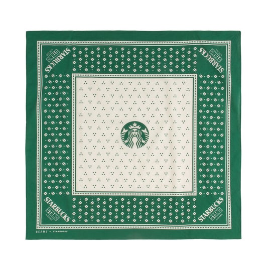 中央には〈スターバックス〉のサイレンロゴ、周囲には三点ドット柄、その外周にはコーヒー豆の総柄が取り囲む遊び心のあるオリジナルデザインのバンダナ。