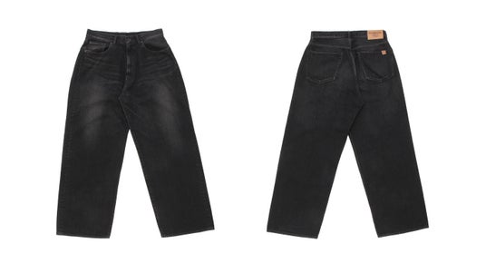 日本製の12.5オンスブラックデニムを採用。色目を落とした後、色の抜けた部分にコーヒー豆の捨て殻を利用した染色剤で特殊な後染め加工(製品洗い)を施し、ブラックデニムに奥行きと上品さを加えました。ヒップポケットの隠しカンヌキやポケット形状など、ヴィンテージデニムのディテールを踏襲しながら、全体にゆとりを持たせて現代的にアップデート。太ももから裾にかけてストンと落ちる、ややストレート気味のシルエットで、快適さとスタイルを両立しています。