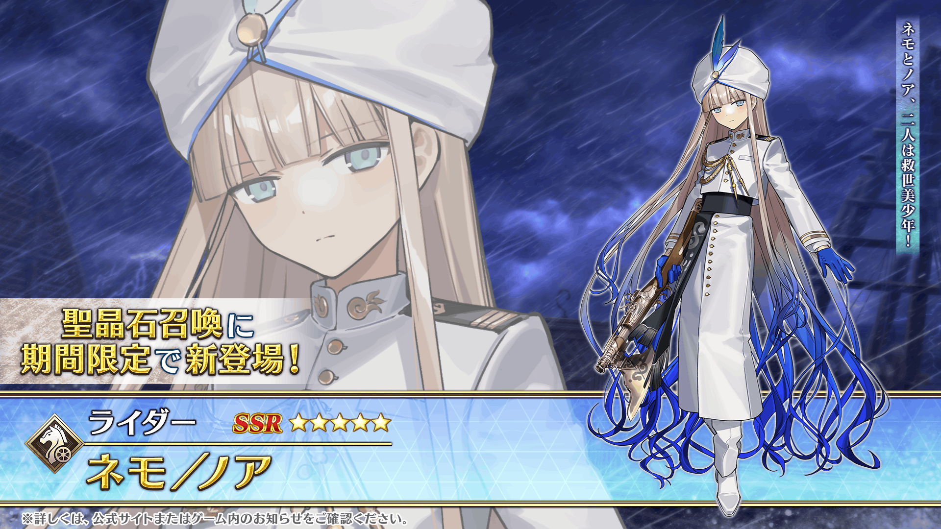 新登場の期間限定サーヴァント「★5(SSR)ネモ/ノア」と「★4(SR)キルケー(オケアノスのキャスター)」、期間限定概念礼装3種をピックアップした聖晶石召喚を開催いたします。
