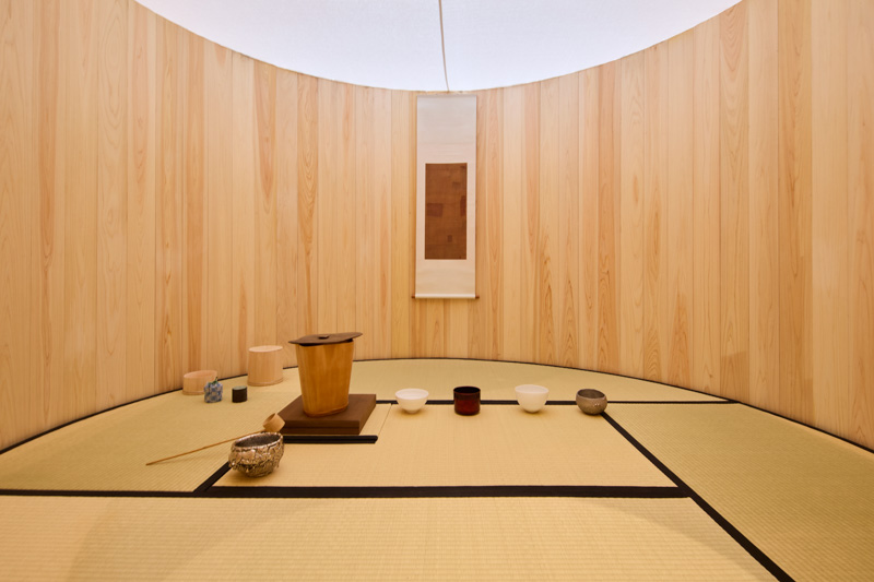 初公開の会場「スタジオあ」にて、初のコラボレーションである中川周⼠さんと相良育弥さんによる《⽊桶と茅葺屋根の茶室》での茶会を開催。