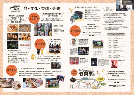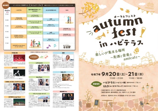 ふくいの美酒と美食を味わいながら、音楽やパフォーマンスも満喫できるイベント「autumn fest in ハピテラス  楽しいが集まる場所 ~美酒と音楽とamical(※)と~」を、9月20日(土)・21日(日)の2日間、JR福井駅前のハピテラスとULOで開催します。