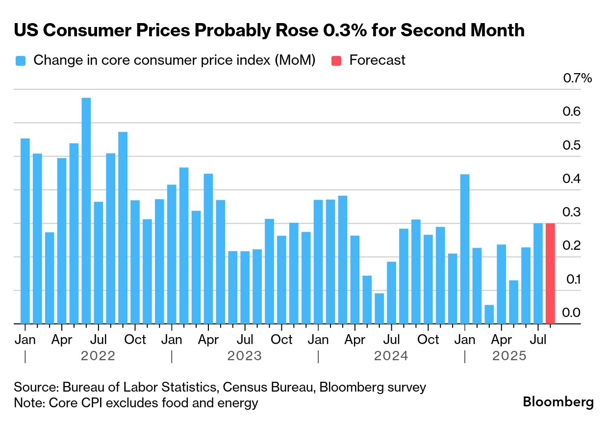 米国では11日に8月の米消費者物価指数(CPI)が発表される。ブルームバーグがまとめた予想中央値によれば、食品とエネルギーを除くコア指数は、2カ月連続で前月比0.3%の上昇が見込まれている。
