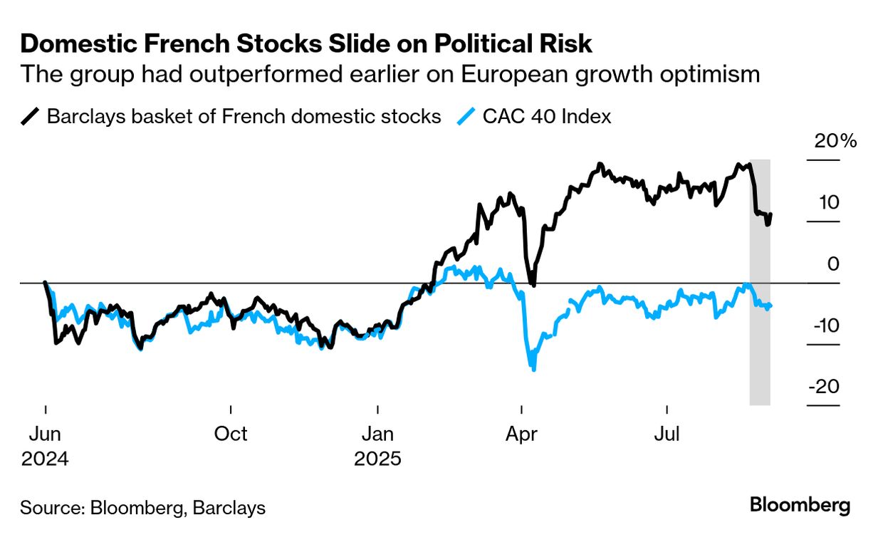 バイル首相が信任投票を求めると8月25日に表明して以降、CAC40種指数は、欧州株の動きを広く反映するベンチマークを上回るペースで下落し、フランス10年国債とドイツ国債との利回り格差(スプレッド)も拡大した。