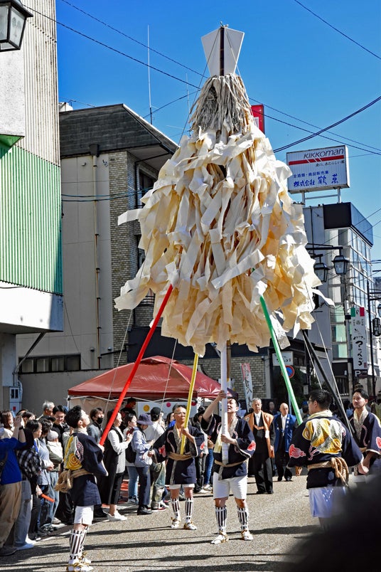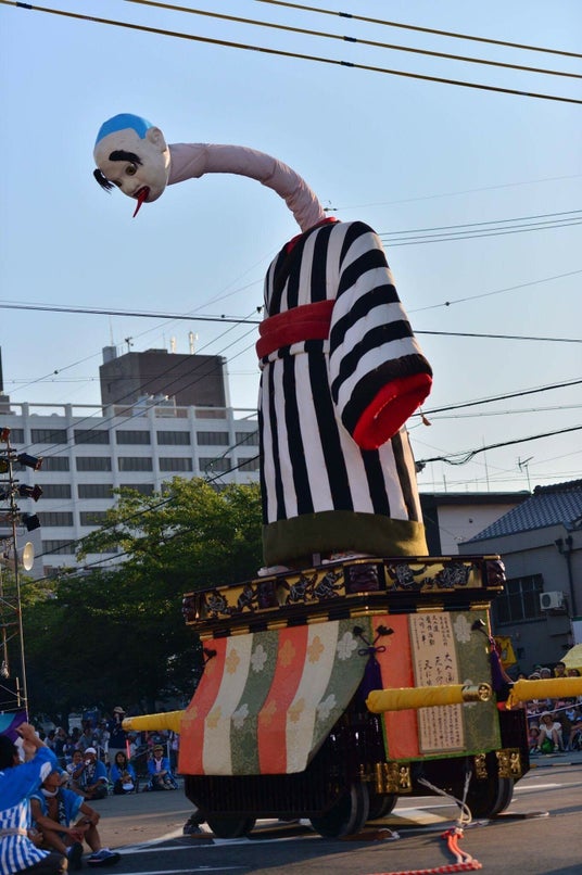 大四日市まつり大入道は、江戸時代後期の文化2年(1805年)に製作されたといわれる。身の丈4.5m、伸び縮みする首の長さ2.7m、高さ1.8mの山車に立ち、全高は9m。からくり人形では日本一の大きさといわれています。山車や人形の中に入った人形師6人が太鼓や銅鑼の音に合わせて操ります。